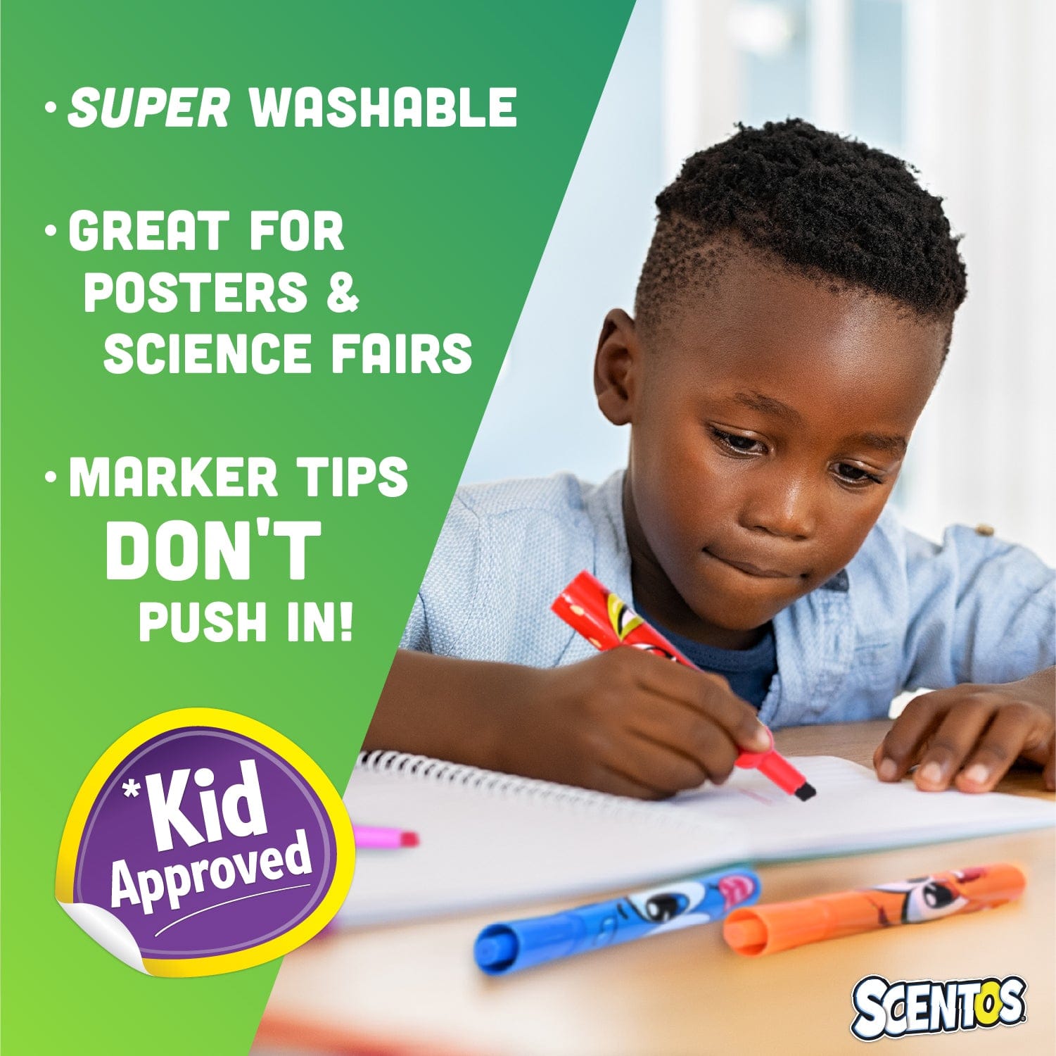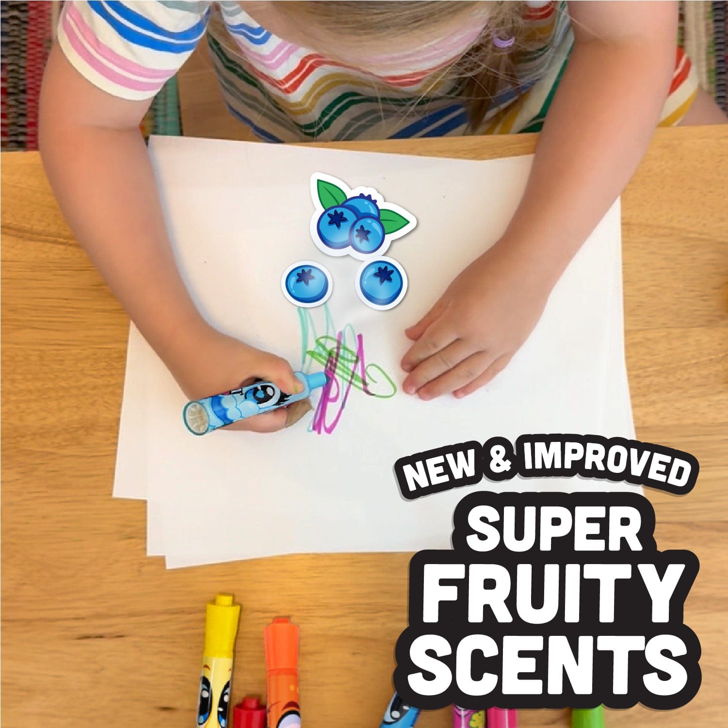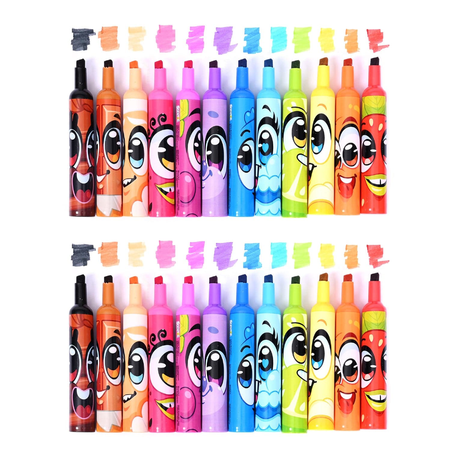 Our scented chisel-tip super-washable markers are back, with a "glow-up" of better scents, cuter characters, and longer-lasting color! This sweet-scented pack of twenty-four (24) scented chisel-tip markers are great for kids and adults, students and teachers, classrooms and everyday play! In 12 fruit-scented bright colors, two sets of each color - with scents like watermelon, strawberry, orange, banana, green apple, blueberry, sugared macaron, chocolate and more - feature friendly characters in each adorable design, great for keeping kids engaged in coloring for longer periods. With the ability to write in a thick or thin line, these markers come in a fun pack, perfect for gifts or everyday, great for posters, projects and more - kids and adults worldwide have fallen in love for fifteen years.
